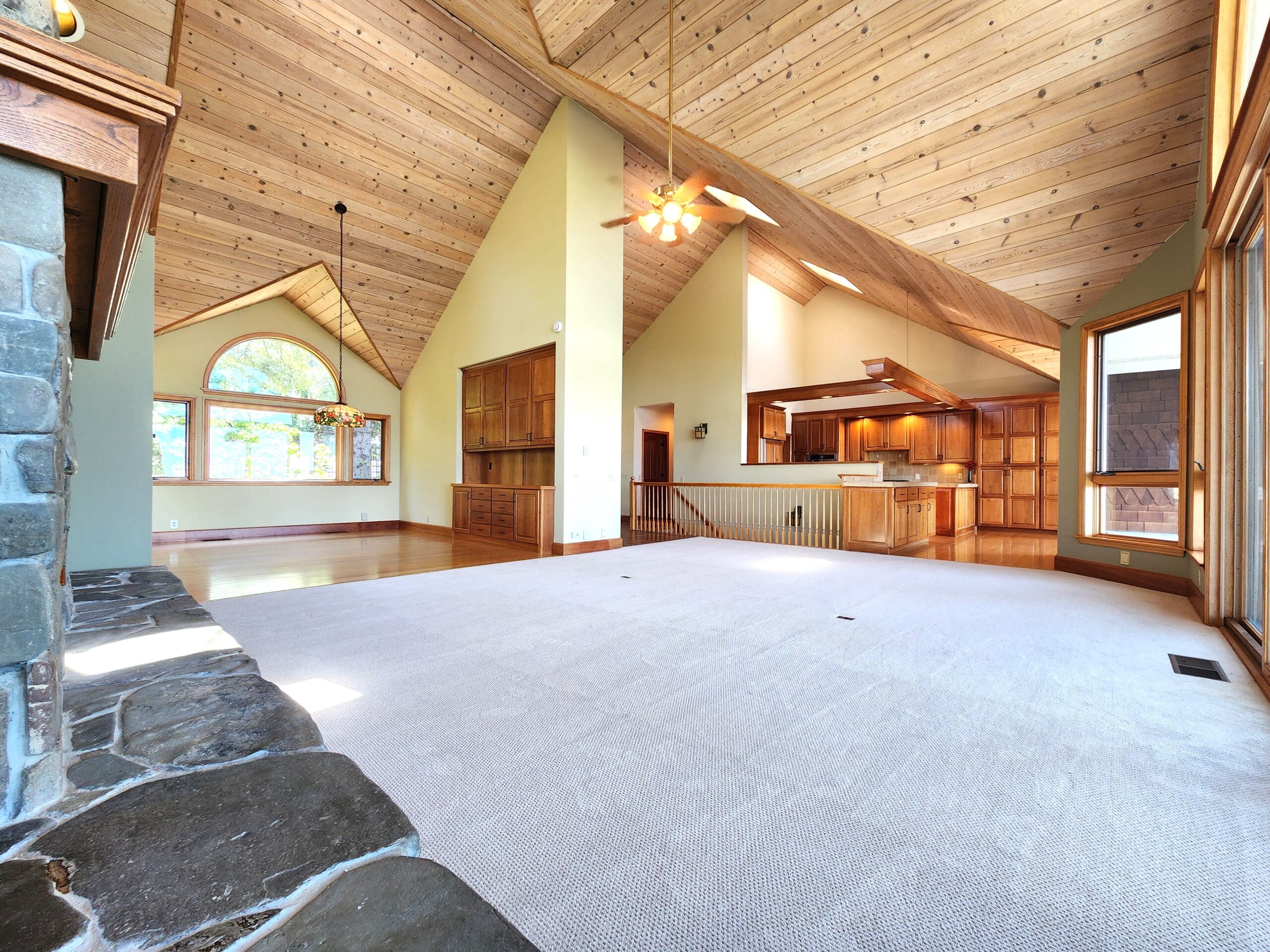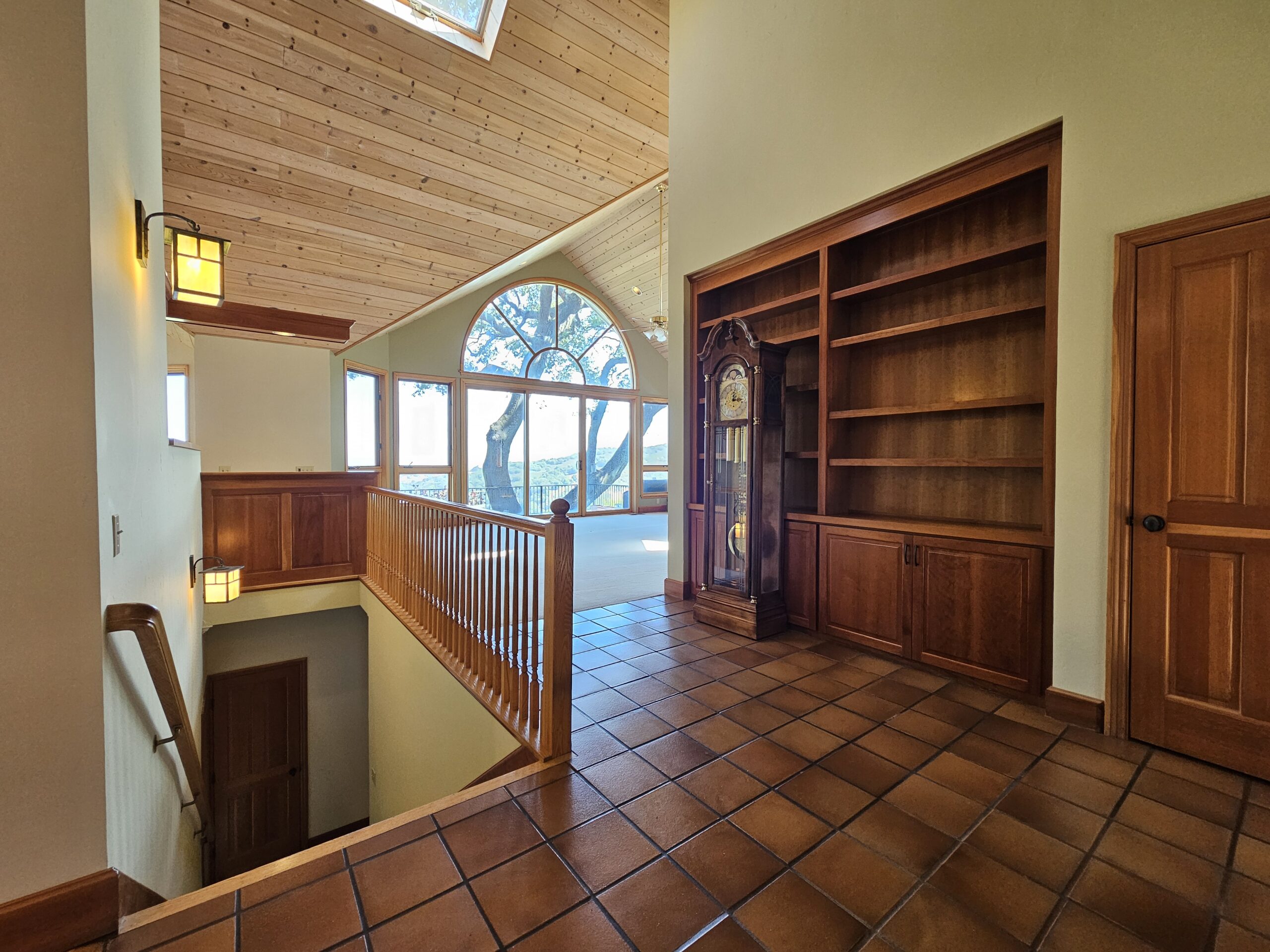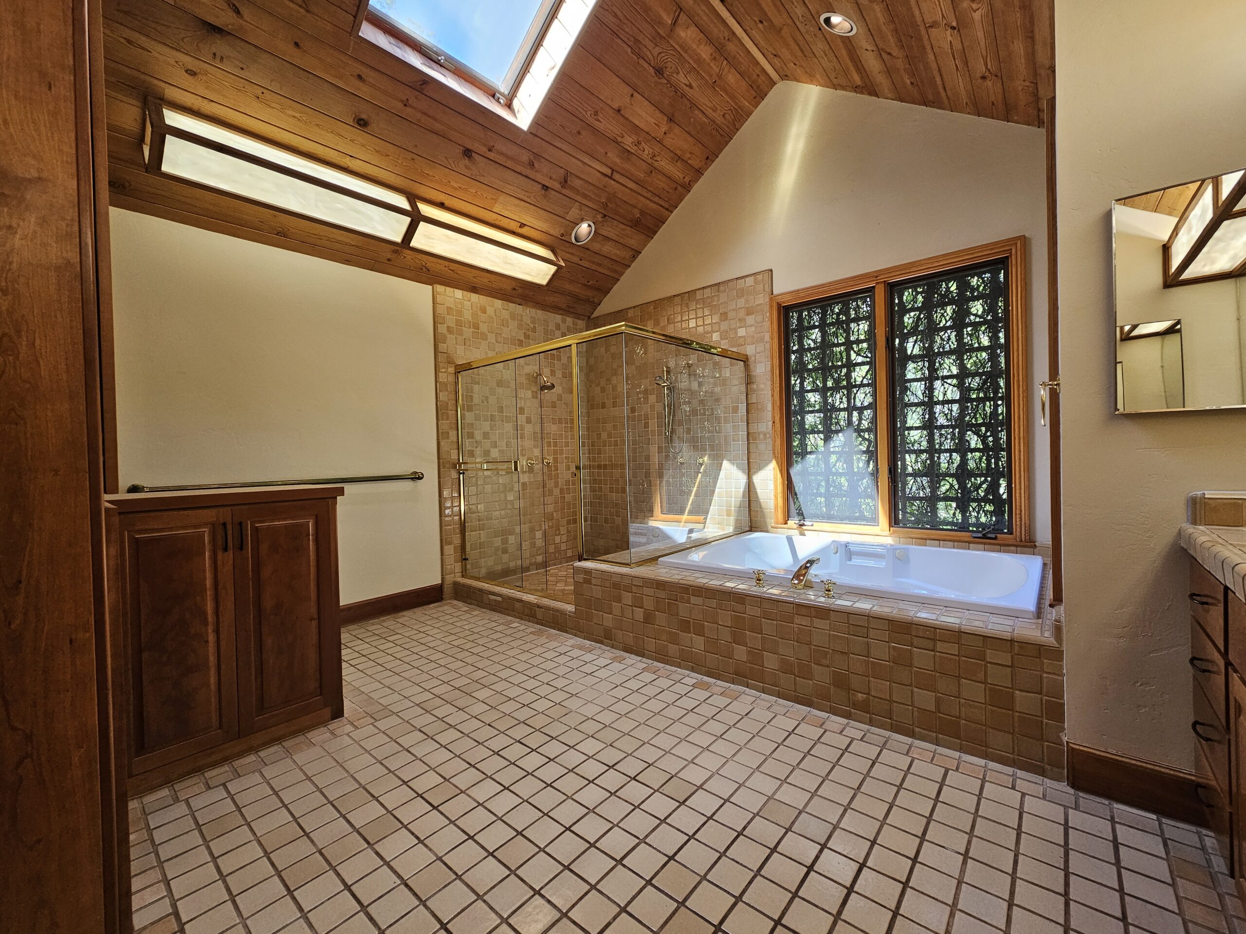The expansive living room features skylights that flood the space with natural light, creating a warm and inviting atmosphere. Adjacent to the living room is a large outdoor patio, ideal for entertaining guests or enjoying peaceful moments outdoors.