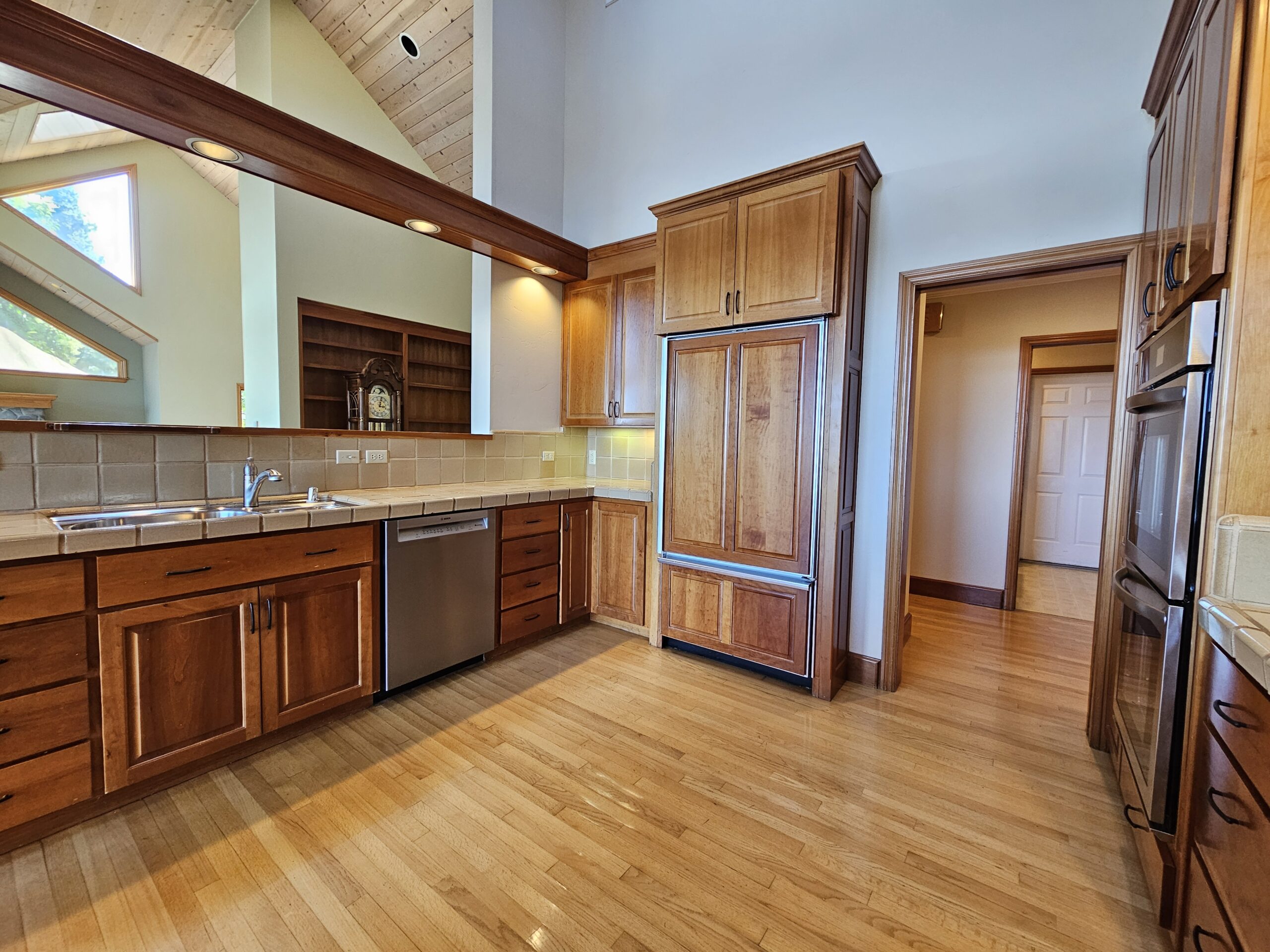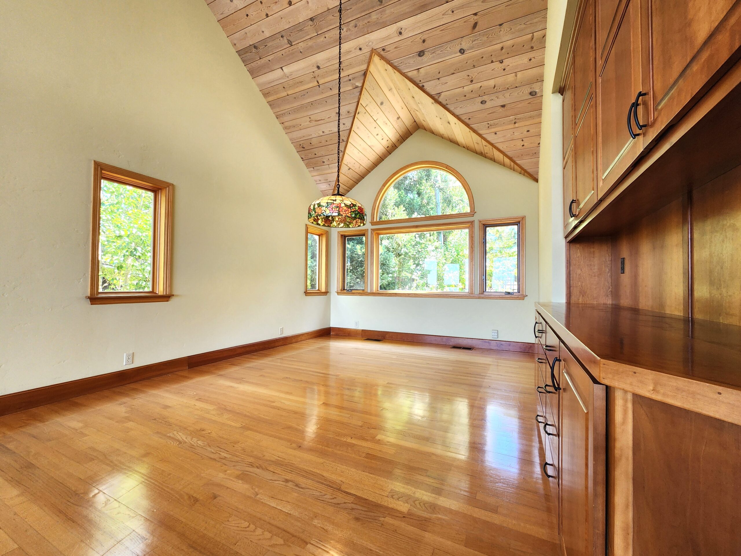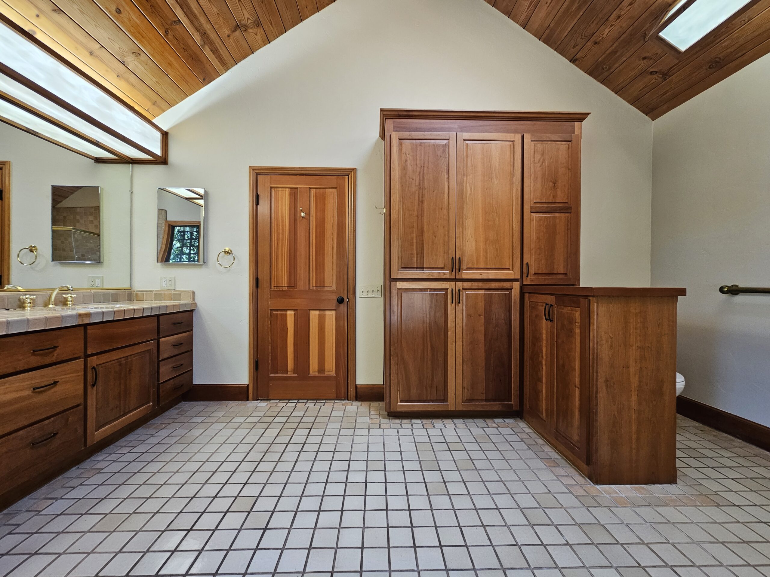 The expansive living room features skylights that flood the space with natural light, creating a warm and inviting atmosphere. Adjacent to the living room is a large outdoor patio, ideal for entertaining guests or enjoying peaceful moments outdoors.