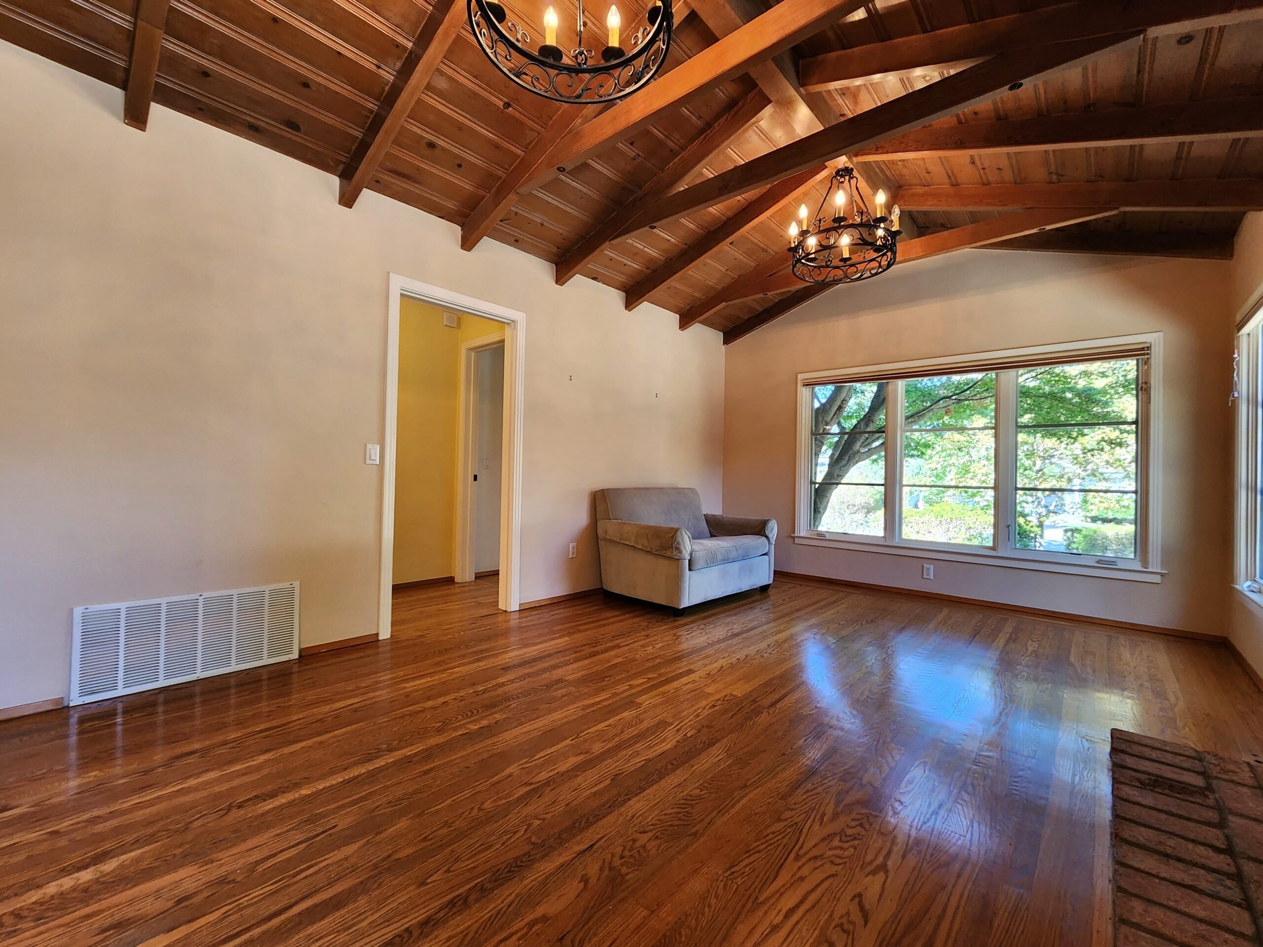 The interior of this home is bright and inviting, with plenty of natural light streaming through large windows. The open living and dining area creates a warm and welcoming atmosphere for relaxing or entertaining guests.