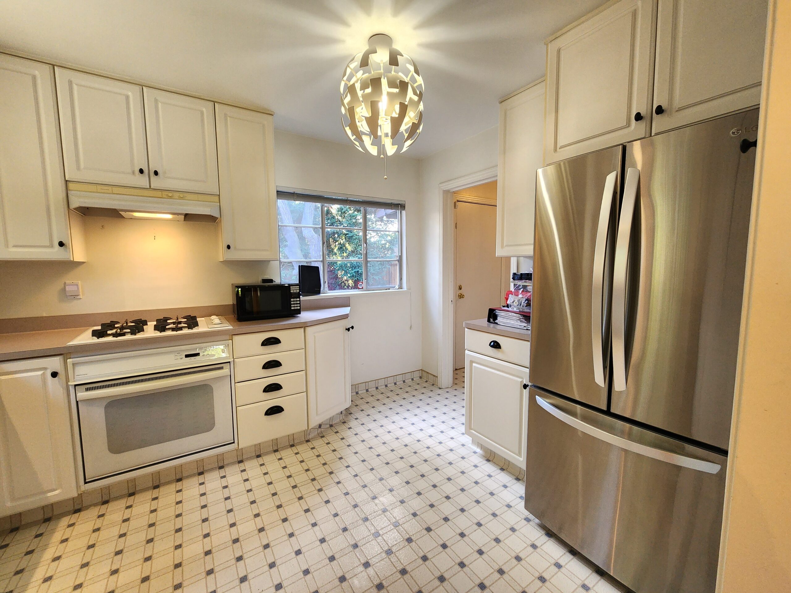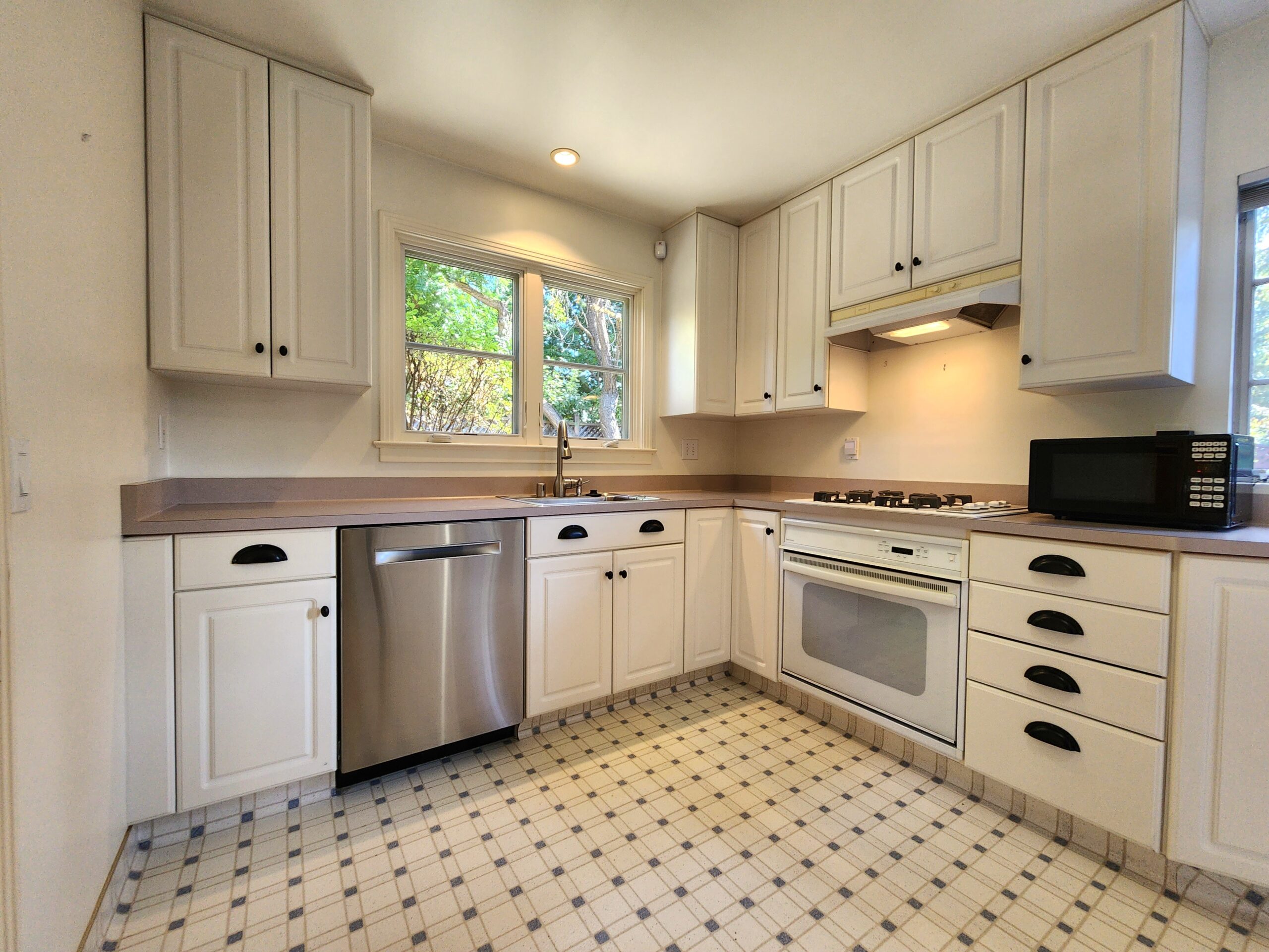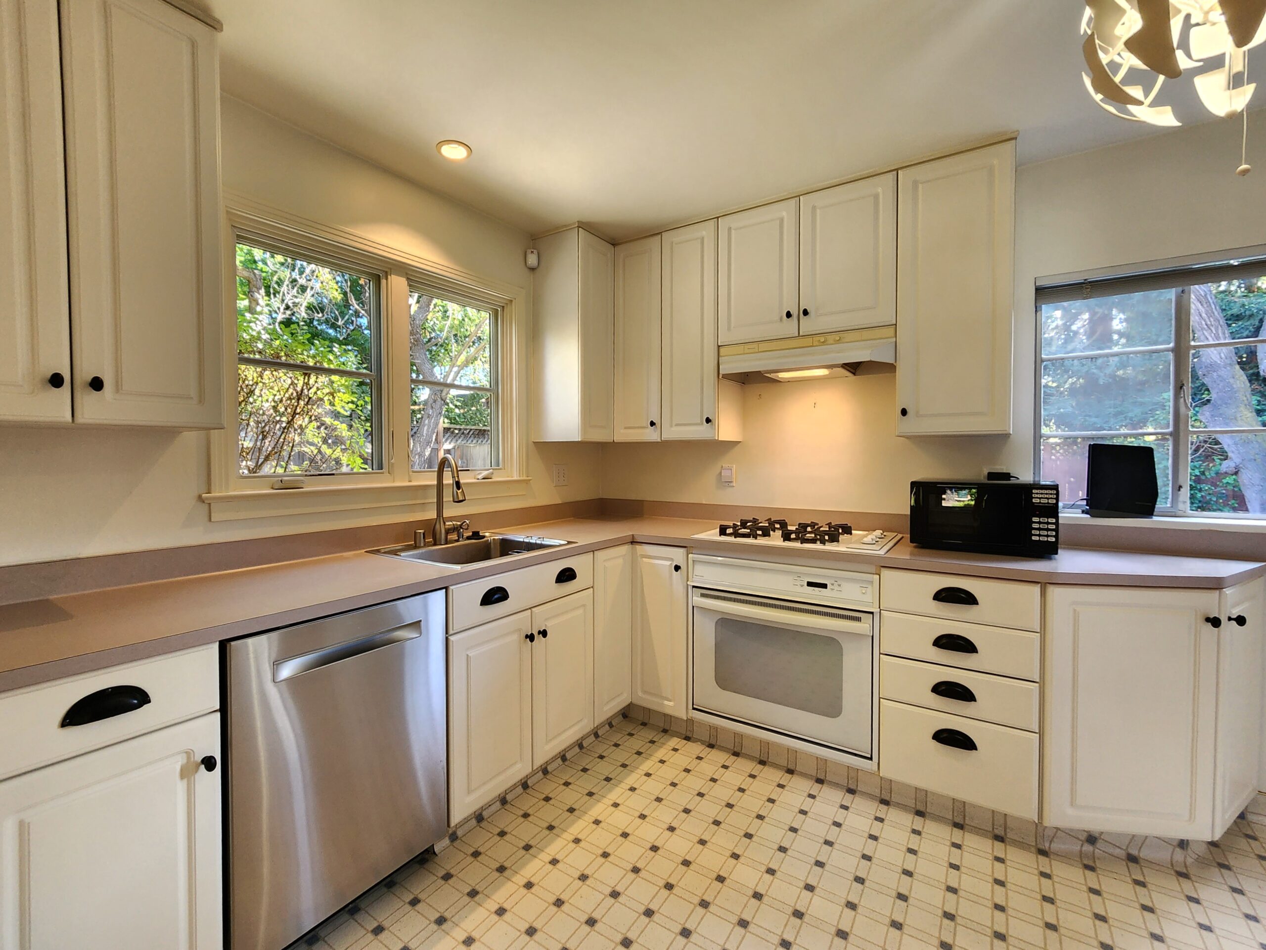 The updated kitchen boasts sleek appliances, including a refrigerator, stove, microwave, and dishwasher. It’s a chef’s dream, making meal preparation a breeze.