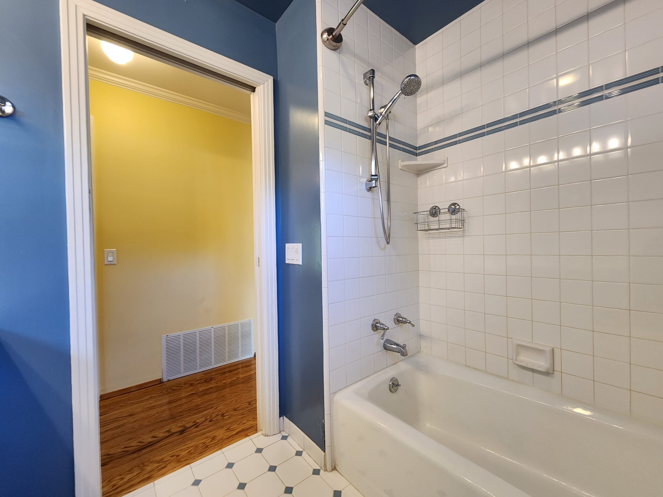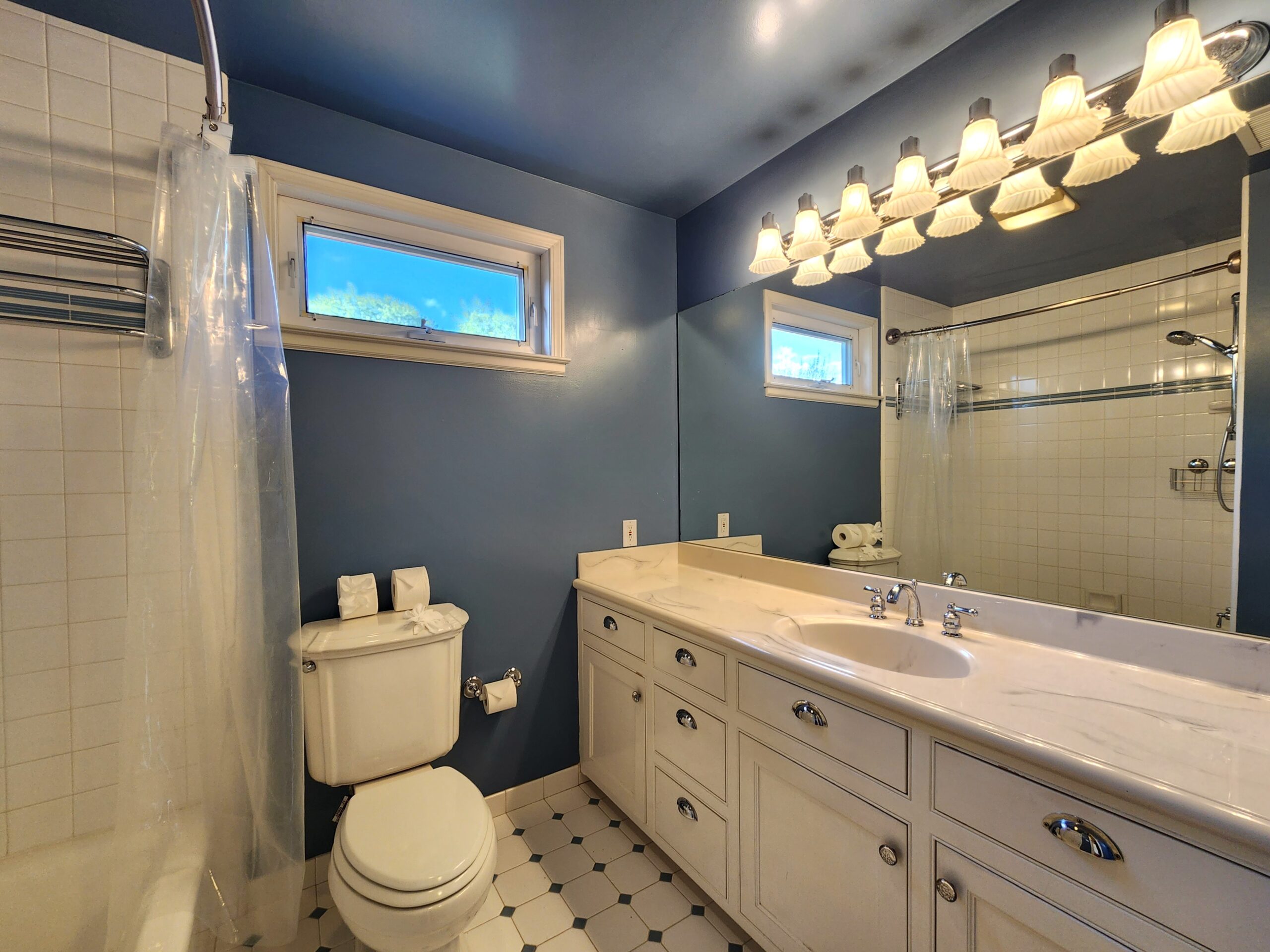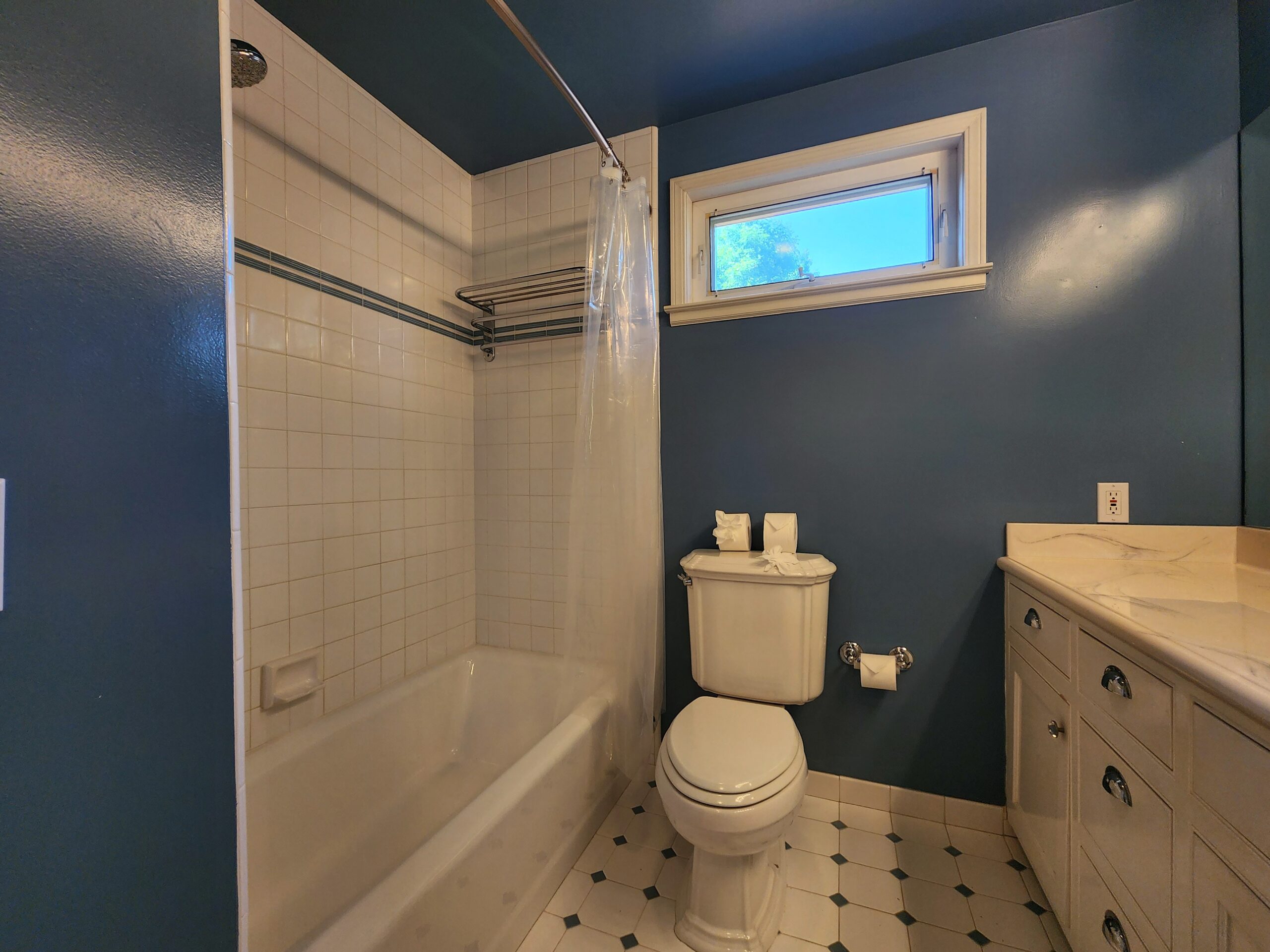 The bathroom is elegantly designed and includes a shower-tub combo and a vanity with storage.