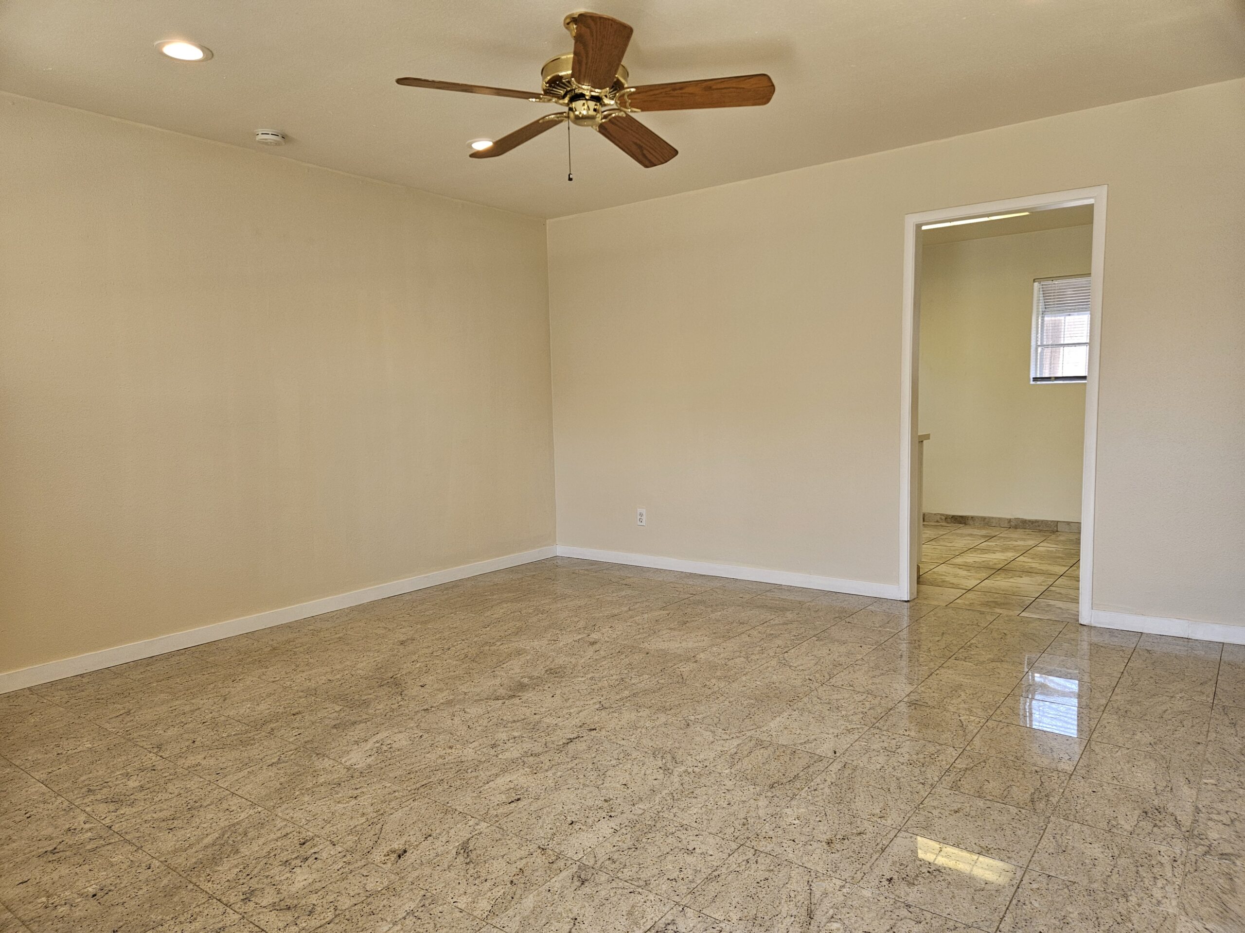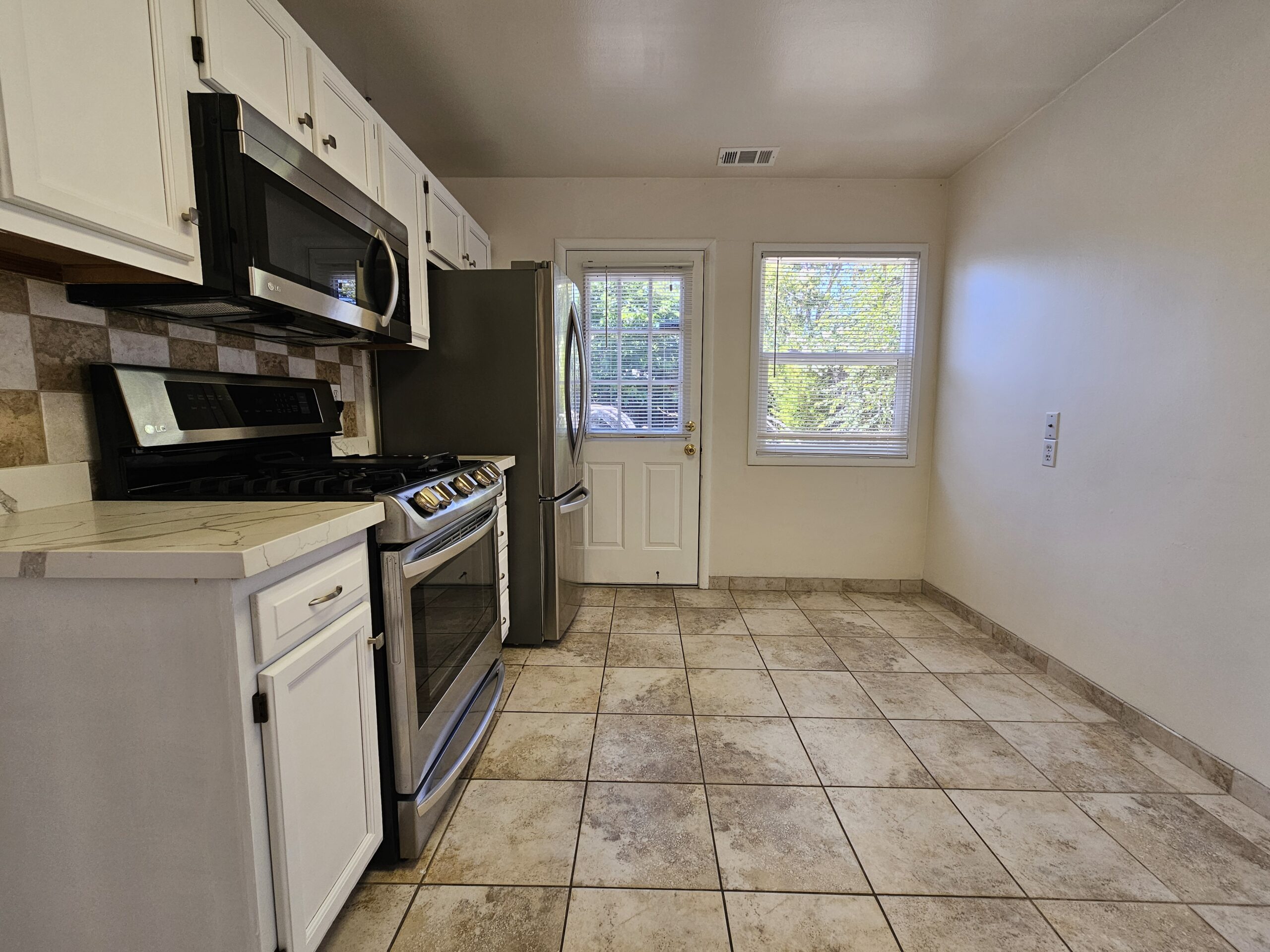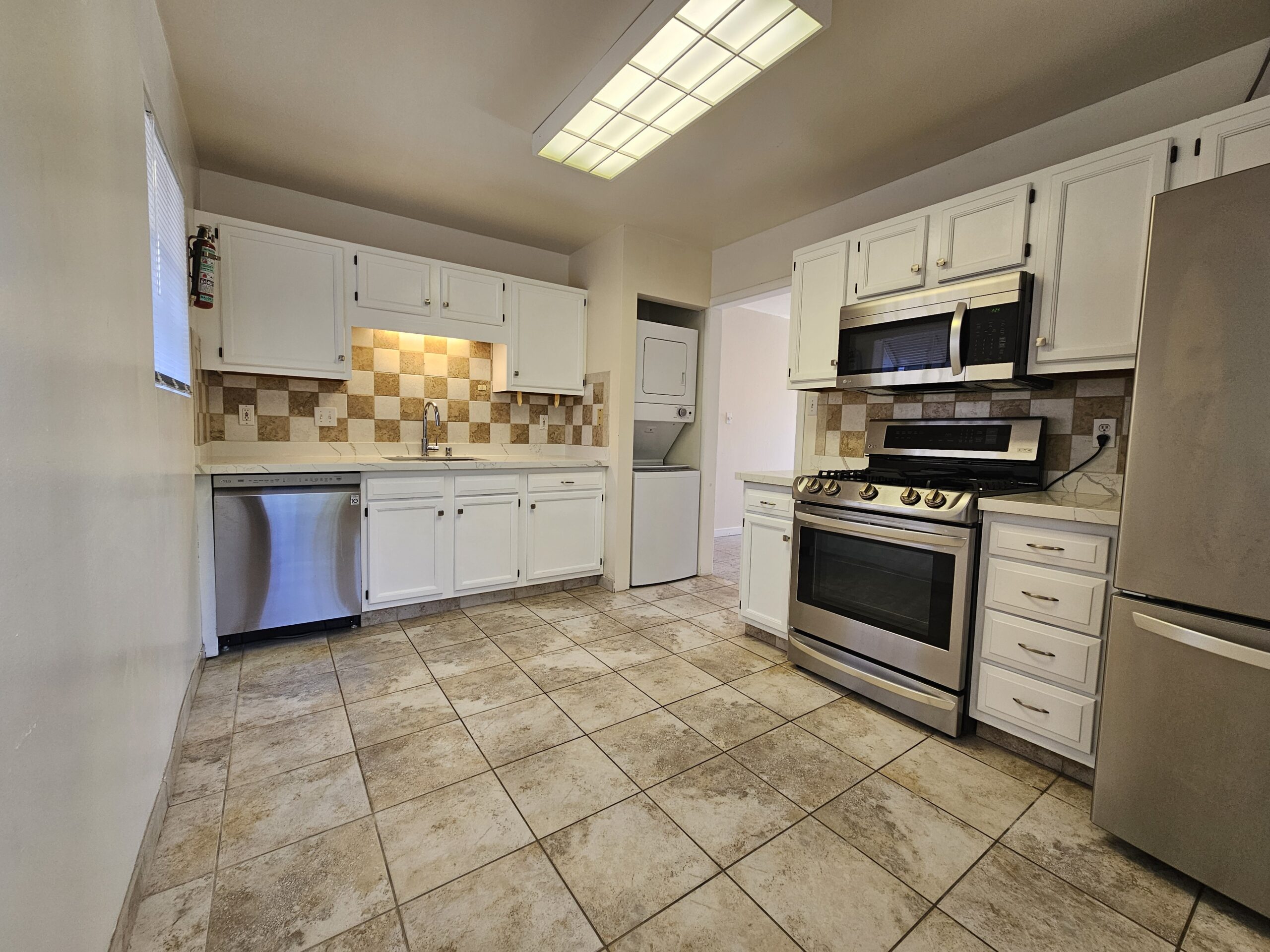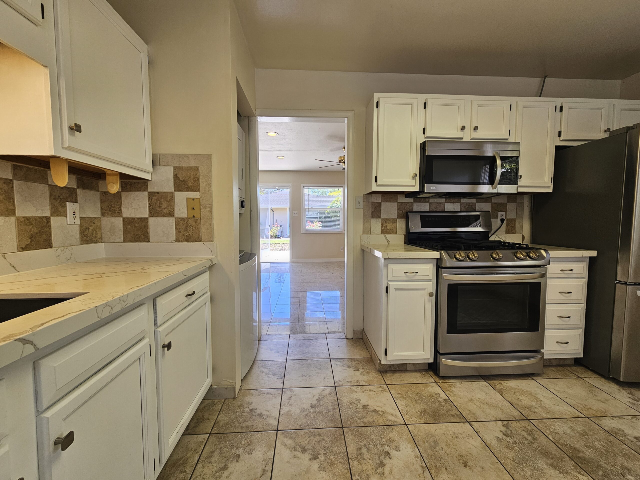 The kitchen is equipped with a stainless-steel appliances and gas stove! Quartz countertops provide a sleek and modern surface for meal prep. Both bedrooms are carpeted and fitted with a ceiling fan. Tile flooring throughout the living and kitchen spaces.