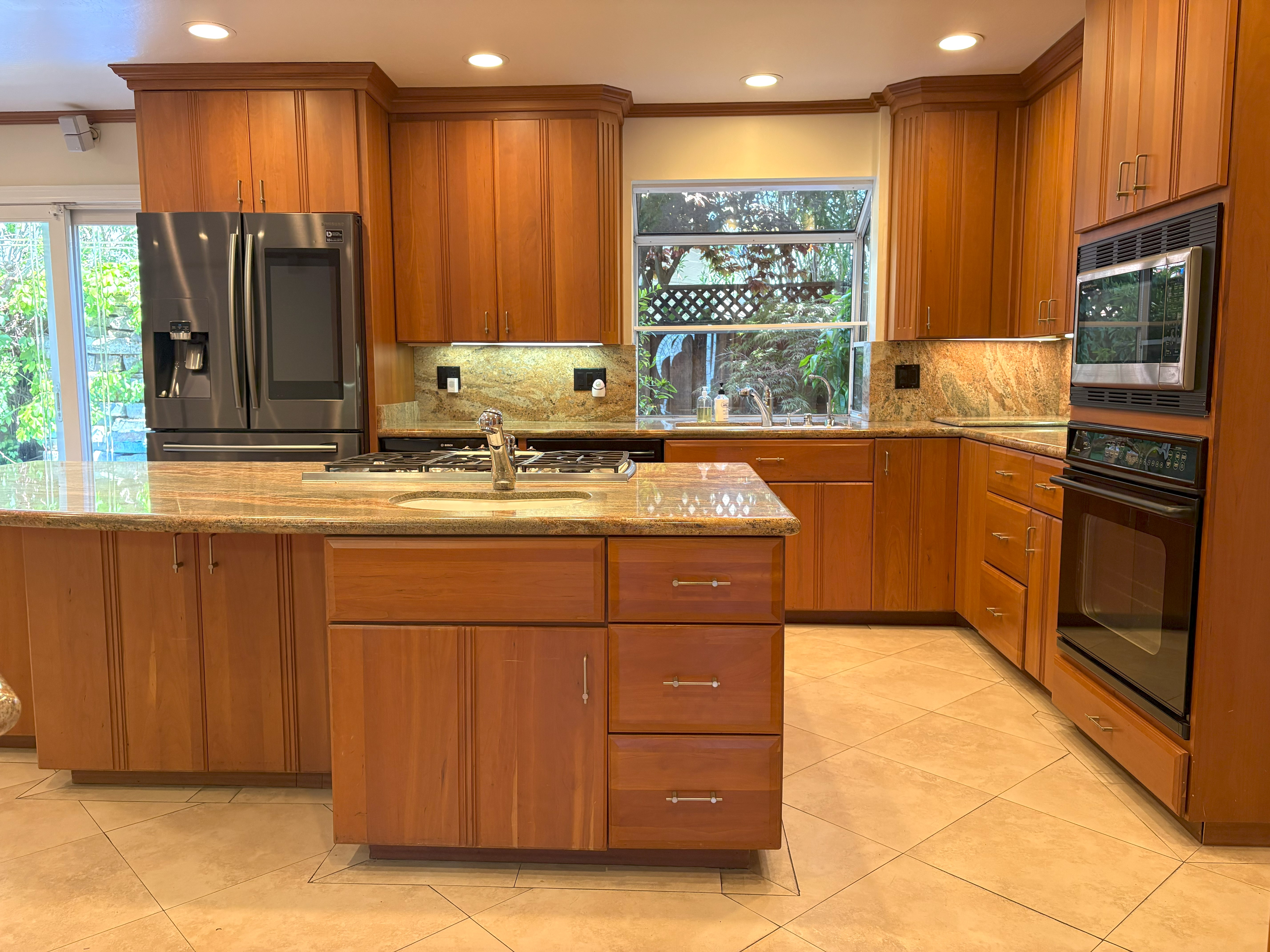 Step inside to find elegant hardwood floors that flow through the main living areas, including the bright and airy living room, and formal dining room. The updated kitchen is a chef’s delight with rich hardwood cabinets, sleek marble countertops, recessed lighting, two dishwashers, and ample space for meal prep and storage.