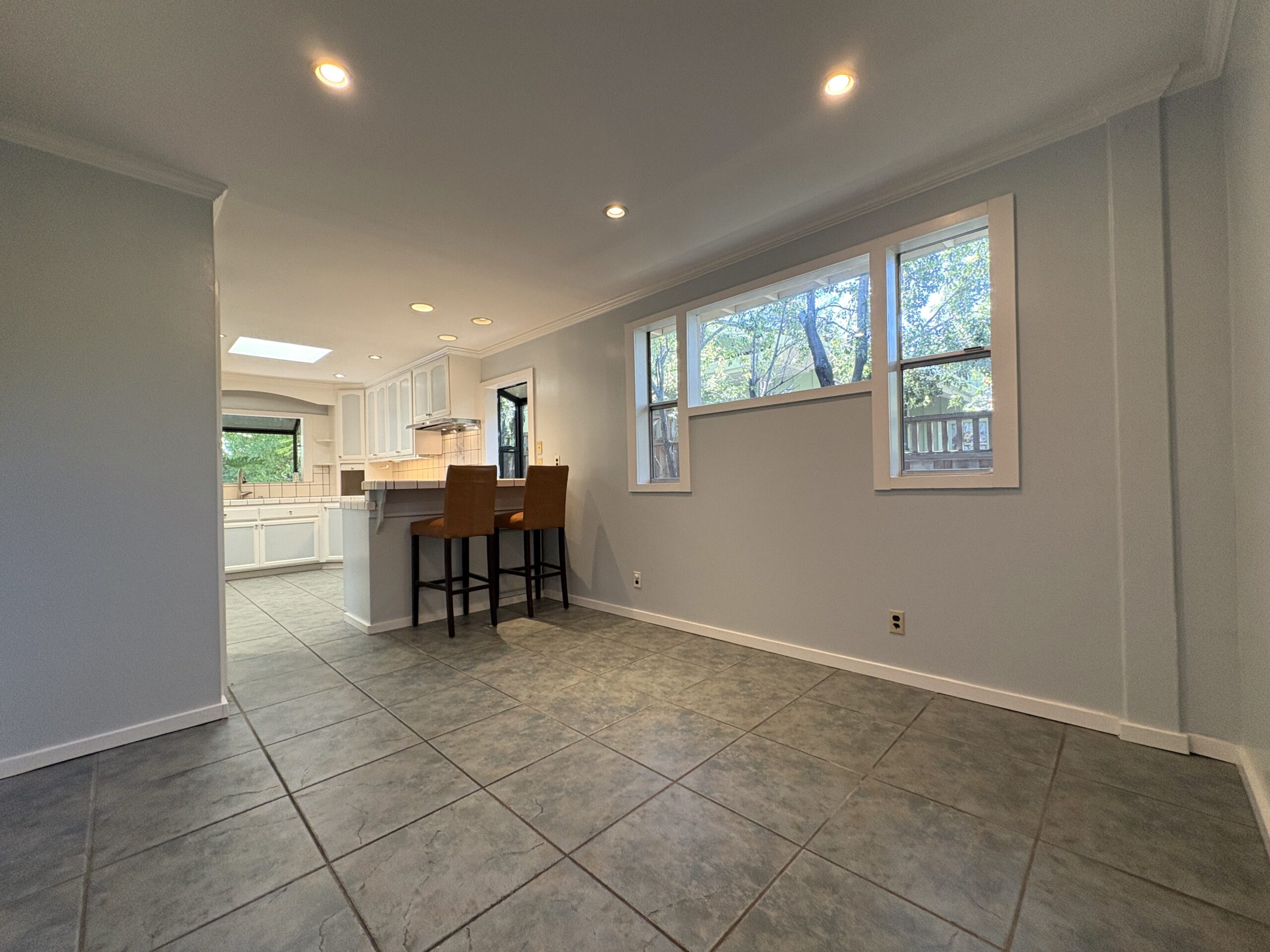 Abundant natural light fills the home through large windows and skylights strategically placed throughout the living areas. The traditional layout includes a cozy, functional kitchen equipped with stainless steel appliances and ample cabinetry.
